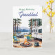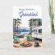 A personalized grandpa's birthday card with a watercolor illustration of a campsite with rv camper, camp fire, a lake and pine trees in the forest. Inside is a sweet poem for Granddad.