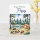 A personalized grandpa's birthday card with a watercolor illustration of a campsite with pine trees, a lake and a tent. Happy birthday Pappy.
