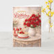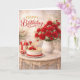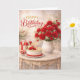 A classic, romantic birthday illustration featuring a lush bouquet of deep red roses arranged in a vintage ceramic pitcher, paired with a beautifully frosted cake adorned with candles and matching rose details. Soft lace textures, elegant gift boxes, and warm glowing light create a timeless cottage-style celebration filled with love, beauty, and refinement.