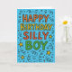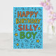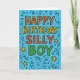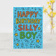 This playful birthday card features bold, hand drawn lettering that reads “Happy Birthday Silly Boy” across a bright light blue background. The design is filled with energetic doodle accents like stars, swirls, dots, and squiggles that create a lively, full composition. Loose, expressive line work gives the card a warm and youthful personality, while the vibrant colors add to the cheerful, celebratory feel. Perfect for a fun loving kid who enjoys bold, colorful artwork.