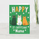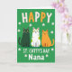 Designed with three stylized cats sitting shoulder to shoulder, this St. Patrick’s Day scene turns “St. Patrick’s Day” into “St. Catty’s Day” with a wink and a little warmth between friends. A sleek black cat with yellow eyes and tiny pink inner ears sits on the left, looking calmly toward the others as if keeping close watch. In the middle, a white cat dotted with lime-green spots smiles with an open mouth, leaning into the group’s cozy, friendly energy 💚. On the right, an orange tabby wears a small, content grin, rounding out the trio like a familiar companion you’re glad to see again. Above their heads, “HAPPY” appears in cutout-style letters that alternate soft white and orange, centered near the top. Across the deep green background, small white shamrocks are scattered like confetti, adding an easy holiday touch ☘️. Below the cats, “ST. CATTY’S DAY” is written in crisp white text, with “Nana” placed underneath in the same white. Share St. Patrick’s Day sentiments with a smile as white shamrocks dot the emerald field around the three cats.
