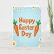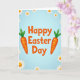 This greeting card centers on the words “Happy Easter Day” in thick, rounded orange lettering with a soft glow, giving the message a cozy, welcoming look 🌷. The text sits prominently in the middle, like a cheerful note meant to be read first, and its warm tone feels like a friendly hug shared between close friends. On both the left and right sides, two tall orange root vegetables mirror each other, their tapered shapes leaning inward as if keeping the greeting company. Each one is topped with a burst of leafy greens, adding a fresh contrast that suggests a gentle, caring touch in the arrangement 🐰. Behind everything, the background fades from a lighter sky blue near the center to a deeper blue toward the edges, creating an open, airy setting. Small white flowers with sunny yellow centers are scattered around the border, forming a soft frame that guides your eyes back to the greeting. The orange lettering sits between the paired vegetables, while the white-and-yellow blossoms dot the blue field like a loose floral ring.