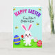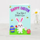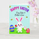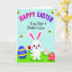 This card features a soft, rounded white rabbit standing front and center, with pink-lined ears, rosy cheeks, and a wide smile that feels like a friendly greeting 🐰. One paw lifts slightly as if waving, while the other holds a single red tulip close to its chest, like a small romantic gesture. The background is split into a gentle sky-blue upper area and a green grassy band below, giving the scene an easy springtime setting. A few tiny yellow-and-black flying insects drift across the blue space, their curly antennae and light wings adding a sweet, social buzz around the rabbit 🐇. Near the rabbit’s feet sit three decorative eggs: one blue with gold horizontal stripes, one white with red dots, and one red with white stripes and small matching dots. Across the top, “HAPPY EASTER” appears in large letters, with “HAPPY” in pink and “EASTER” in purple, each word slightly tilted for a lively look. Beneath that, a smaller line of text reads “To my Sister & Brother in Law,” centered and set in a flowing style that softens the message. The tulip’s red petals stand out against the rabbit’s white fur, and the eggs form a neat row along the grass under the waving paw 🌷.