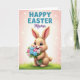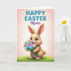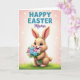 Designed with a sweet digital illustration, the card centers on an upright long-eared bunny with soft light-brown fur, big blue eyes, and rosy cheeks that give it a gentle, affectionate look 🐰. It holds a bouquet close to its chest like a shy gift for someone special, with pastel pink, baby-blue, and soft-white blooms nestled in fresh green leaves 🌷. The bunny stands on a small patch of green grass, with blades reaching up as if it’s early spring. Near the top, the words “HAPPY EASTER” appear in large blue letters, spaced evenly above the character. Just beneath that, “Mama” is written in purple, in a flowing handwritten style that feels like a tender note added for a loved one. Behind everything, the background fades from light pink at the top into a glowing white around the bunny, creating a soft spotlight effect. Faint, round light orbs drift across the backdrop, like gentle sparkles in the air.