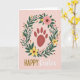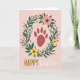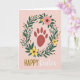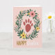 This design shows a centered, stylized paw print in deep earthy reddish-brown, set like a quiet sign of a beloved little companion close by. Around it sits a circular wreath that feels like a friendly hug, built from rich deep green leaves on a soft pale blush background. Tucked into the greenery are soft pink blossoms with darker centers and sunny yellow flowers, arranged so they seem to lean toward one another like close friends sharing a secret 🌷. Small bright red berries and tiny yellow accents are sprinkled throughout the ring, adding little points of energy without crowding the space. The lighting stays even and gentle, keeping the illustration flat and smooth while letting the colors do the talking. Beneath the wreath, the word “HAPPY” appears in a textured golden color, and just below it “Easter” is written in white, flowing lettering 🐇. The text is centered under the wreath, with the gold word sitting above the white word against the same pale blush background.