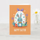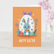 Designed with a stylized blue bunny at the center 🐰, the illustration uses soft rounded shapes, long ears, rosy cheeks, and a wide smile, with a small orange bow tie that adds a sweet, friendly touch. The bunny sits in front of a large white egg-shaped backdrop, like a spotlight that frames its face and makes the expression feel extra warm. Behind it, a soft orange field fills the scene, giving the cooler blues a gentle contrast and keeping everything bright and springlike. Around the bunny, decorated eggs in red, green, blue, and yellow are scattered with dots and stripes, like they were placed there for a shared little celebration. Along the bottom edge, purple flowers with yellow centers rise from leafy green stems 🌷, and the close spacing makes the scene feel like a cozy garden moment. Small white starburst shapes and faint circular accents float across the background, adding a light, dreamy sparkle without crowding the main figure. The words “HAPPY EASTER” appear in large white letters near the upper area of the design, clearly set against the orange background. A lavender bow sits on top of the white egg shape, and a tiny red strawberry appears nearby as a bright detail.