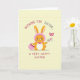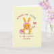 This design shows an orange bunny character with wide, gentle eyes and rosy cheeks, dressed in a soft pink hood that lets two long ears rise above its head 🐰. It stands against a pale yellow background with faint horizontal lines that resemble lightly textured paper. In one paw, the bunny carries a pink basket with light stripes, angled slightly as if it’s just been brought over for a visit. With the other paw, it extends a small sprig of three pink blossoms and green leaves, like a sweet offering between close friends or sisters 🌷. A bright pink butterfly floats near the top, its patterned wings tilted as though it’s circling the flowers. Curved text arcs above the character in a handwritten look, reading “WISHING YOU SISTER, A VERY HAPPY EASTER,” with most words in red and “SISTER” in a deeper, slightly muted red. The basket’s stripes, the flower petals, and the butterfly’s wing markings add small, tidy details against the soft yellow backdrop.