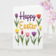 This design shows an overhead studio-style layout on a white background, with “Happy Easter” set in raised, sculpted lettering at the center. “Happy” sits on the top line in glossy purple, with rounded edges that catch the light like smooth icing. Just below, “Easter” appears in warm yellow, matching the same dimensional style and creating a friendly, welcoming contrast. Around the words, eight tulips form a balanced frame, their green stems and leaves leaning inward as if gathering close for a shared moment 🌷. The petals mix scarlet red, blush pink, sunny yellow, and two deep purples that echo the top word, giving the arrangement a gentle sense of togetherness 🐰. The text is centered and evenly spaced, with the purple line slightly above the yellow line so your eye reads top to bottom in one glance. The lighting is soft and even, leaving almost no shadows while highlighting the smooth letter surfaces and the fine veins in the tulip petals.