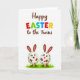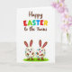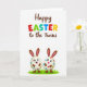 This greeting card features a bright seasonal scene on a wide white background, with the message placed across the top in a friendly, casual lettering style. “Happy” and “to the Twins” appear in warm brown, while “EASTER” sits in the middle of the line with each letter in a different color—red, green, blue, and yellow—like a little burst of celebration. Below the text, two rounded egg-shaped characters stand close together, their bodies creamy white and sprinkled with red, blue, green, and yellow polka dots. Each has upright bunny ears with brown tips 🐰, small brown arms and legs, and dark shiny eyes above rosy cheeks and tiny pink smiles. The pair leans slightly toward one another, giving the scene a gentle, affectionate friendship feel 🐇. A thin band of green grass runs along the bottom edge, grounding them in a simple spring setting. The letters stay centered near the top while the two dotted egg-bunnies are positioned side by side beneath, with the green grass strip stretching straight across the base.