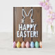 This design shows a tall, portrait-style scene set on warm brown wooden planks with visible grain and vertical lines. Near the top, a simple white line drawing of a long-eared bunny 🐇 sits lightly against the rustic background, giving the layout a gentle, friendly tone. Just below it, the words “HAPPY EASTER!” appear centered in large white all-caps letters, standing out clearly against the wood. A faint shadow under the letters makes the message look slightly raised, like it’s hovering above the surface. Along the bottom edge, a neat row of decorated egg shapes forms a border, arranged close together like they’re sharing space in a cozy lineup 🌷. The eggs are painted in soft pastel pink, sunny yellow, and mint green, and the patterns include blue-and-white stripes, orange swirls, and small polka dots that feel like little gestures exchanged between friends. The lighting is even and soft, bringing out the texture of the wood and the brushed paint details. The lower border shows multiple pastel eggs with mixed patterns lined up tightly across the full width of the card.