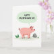 This animal greeting card features a bubblegum-pink cartoon pig with a simple shape, rosy cheeks, and a curly corkscrew tail. The pig looks a little shy, with eyes tilted upward and a small, content smile that feels sweet and friendly. It stands on a pale green patch of ground with a few deep green leaves nearby and a smooth gray rock off to the side. The background is plain white, keeping all the focus on the pig and its message. Above the pig, there’s a large light-green speech bubble that holds the main text. The words “HAPPY VALENTIN-SWINE DAY,” appear in black, block-style letters and sit centered inside the bubble. The pun adds a fun Valentine’s Day touch while still feeling warm and caring ❤️