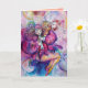 Clown rose, coloré, capricieux, drôle jouant du bugle avec un hibou expressif et des notes musicales joyeuses, fleurs, feuilles en rouge vif, fuchsia, violet, violet, bleu, couleurs blanches, aquarelle de Bulgan Lumini (c)