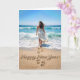 A woman in a flowing white dress strolls along a sandy beach, where 'Happy New Year' is carved in the sand, capturing a serene moment by the ocean.