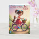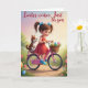 This card features a smiling young girl riding a pink bicycle along a sunlit dirt path, her rosy cheeks and bright eyes turned forward as if she’s sharing the moment with someone beside her 🌷. Her hair is in pigtails tied with blue bows that match her blue shoes, and her simple red dress flutters slightly as she pedals. A small reddish-brown and white dog rides on the back, wearing a blue collar and a tiny red bowtie, leaning in close with its tongue peeking out like an eager friend 🐰. The bike’s front basket is woven and packed with patterned, brightly colored eggs, suggesting a spring celebration. Along the path, green grass borders the trail, and small pink blossoms dot the edges where a few decorated eggs rest like little surprises. In the distance, soft green trees sit under a sky that fades from warm golden light near the horizon into a pale blue above. Near the top, the message “Easter wishes, Just for you” appears in a flowing dark font, centered against the light sky.