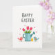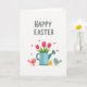 The front design shows a simple pastel scene with the greeting “HAPPY EASTER” placed across the top in a dark, hand-drawn style. Beneath the words, a light teal watering can sits in the center, tipped slightly as if just set down after tending a garden. Three deep pink tulips rise from the opening, with slim green stems and leaves that lean gently toward one another like close friends 🌷. On the left stands a round little bird in soft rose tones, angled toward the flowers with an attentive, tender posture. On the right, a round sky-blue bird looks toward a single golden egg on the ground, as if sharing a quiet, curious moment 🐇. Small red heart shapes are scattered around the birds and flowers, adding a cozy, affectionate touch without crowding the space. The background stays bright white, and the egg’s warm yellow-gold color stands out near the lower right of the scene.