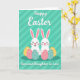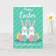 This card shows two stylized white bunnies 🐰 standing side by side in the center, their tall ears softly lined with pink as they smile with tiny dot eyes and fine whiskers. Their close, mirrored poses suggest an easy closeness, like a couple or close friends sharing a quiet moment together. Around them sit five decorated egg shapes, each filled with stripes or dots in sunny yellow, soft rose, and cool aqua tones. The background is a teal-aqua field with faint diagonal stripes in a lighter shade, adding gentle movement without crowding the scene. Near the top, the words “Happy Easter” appear in flowing white lettering with a subtle shadow that helps it stand out. Near the bottom, “Son and Daughter in Law” is written in matching white lettering, centered beneath the bunnies, with a small 🌷 accent nearby. The eggs are positioned to the left and right of the pair, balancing the layout against the teal striped backdrop.