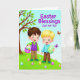 This greeting card shows two young boys standing close together on an emerald-green lawn dotted with decorated egg shapes, their shared smiles and rosy cheeks hinting at an easy friendship 🐰. A leafy tree with fresh green branches frames the left side, while a light blue sky opens up behind them for an airy spring setting. The boy on the left has brown hair and wears a bright green shirt under a plum-colored vest as he holds a pink basket with striped sides, angled toward his friend as if inviting him to look. The blonde boy beside him wears a sky-blue shirt and lifts a larger pale green egg with delicate, nature-like patterns, as though proudly showing off a find. Their relaxed, slightly turned-in posture and the way their faces tilt toward each other adds a tender, companionable feel to the scene. In the upper area above the illustration, a friendly message sits centered in purple lettering, standing out clearly against the sky 🌷. Two butterflies—one orange and one magenta—flutter near the upper right corner.