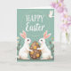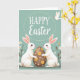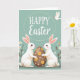 Designed with a soft spring scene, the card shows two rounded white rabbits at the bottom, facing each other with tender gazes that suggest a close bond 🐰. Their dark eyes, faint rosy cheeks, and pale pink inner ears stand out against their snowy fur, while tufts of green grass curl around their paws. Between them sits a large chocolate-brown egg, decorated with yellow floral shapes and small pink blossoms like sweet icing. White daisies with sunny yellow centers and a few scattered wildflowers fill the foreground, adding gentle color and a romantic garden feel 🌷. The background is a calm teal wash that keeps the lighter details easy to notice. Near the top, the words “HAPPY Easter” appear in flowing white lettering, with a dotted arc curving above as a light frame. In the upper right, a white dove with a red beak glides with wings spread wide.