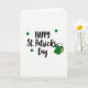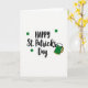 This card features a white background with “HAPPY St. Patrick’s Day” centered in black lettering, with “St. Patrick’s Day” set just beneath “HAPPY” for a layered look. Deep green shamrocks are scattered around the words, drifting like confetti and giving the layout a lively, friendly rhythm ☘️. On the right side, a stylized green beer mug leans slightly, as if raised toward someone across the table in a quiet toast 💚. The mug has a thick, foamy white top, and a yellow-gold handle and rim that add a warm accent against the greens. The spacing leaves plenty of open white area, so the message stays easy to read while the icons frame it. The shamrocks vary a bit in size and placement, which makes the scene feel like two friends decorating together, trading smiles as they go. The palette stays mostly black, white, green, and a touch of yellow, with the mug and shamrocks balancing the text in the center. Several shamrocks float near the top-left and bottom-left corners while the tilted mug holds the right edge.