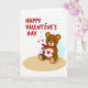 This Valentine's Day card shows a brown teddy bear sitting on a sandy-tan oval near the lower right, smiling with big black eyes. The bear wears a red scarf and holds a small white card with a bright pink heart on it, like it’s offering a sweet note. Behind the bear, there’s a light blue, cloud-shaped area that makes the scene feel soft and calm. In the upper left, the words “HAPPY VALENTINE’S DAY” appear in red letters, and the apostrophe is a tiny red heart. A few small pink hearts float upward nearby, adding a gentle romantic touch 💘. The white background keeps everything simple and easy to notice, with the reds, pinks, and blues standing out clearly. It’s a warm, friendly design that feels perfect for love, kindness, or close friendship ❤️😘.