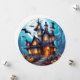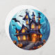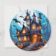 Carte d'Halloween à l'aquarelle mignonne avec une maison hantée, des citrouilles drôles et des chauves-souris. Personnalisez facilement cette belle carte d'Halloween avec votre nom de famille.
