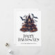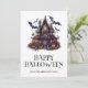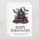 Belle carte Halloween avec une maison hantée, citrouilles et chauves-souris. Personnalisez facilement cette carte d'Halloween aquarelle avec votre nom de famille et votre texte.
