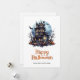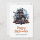 Carte d'Halloween avec une maison hantée, la pleine Lune, les chauves-souris et un squelette fantôme. Personnalisez facilement cette carte d'Halloween aquarelle avec votre nom de famille et votre texte.