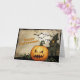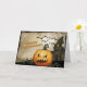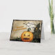 Carte Haunted House & Jack o' Lantern Halloween. Une carte de Vacances Halloween vraiment cool avec une maison chassée à flanc de colline, une Jack-o'-lantern déplaisante et une grande lune avec des chauves-souris volant au-dessus !