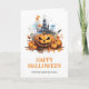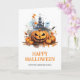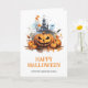 Carte d'Halloween aquarelle personnalisée avec un citrouille avec un visage effrayant, feuilles en chute, chauves-souris et un manoir hanté. Personnalisez facilement cette belle carte d'Halloween aquarelle avec votre nom de famille, photo et texte.