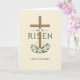 This card features a central wooden cross drawn with simple line details that suggest a rustic grain, set on a creamy off-white background for a calm, gentle look. Above the crossbar, the words “HE IS” sit in small dark gray letters, leaving airy space around them. The word “RISEN” appears larger in olive green, with several letters overlapping the vertical beam as if leaning in close, like a tender embrace. Beneath the base of the cross, a small wreath of white flowers with golden centers and fresh green leaves adds a soft spring touch 🌷. Tiny golden specks float around the floral ring, like warm glints catching the light. Along the bottom edge, “EASTER BLESSINGS” is placed in a neat sans-serif style in dark gray, centered and easy to read. The palette stays earthy and gentle, with the cross and lettering standing out clearly against the light background 🐇. The flowers form a loose circle with five-petal blooms and layered leaves, clustered just under the cross.