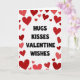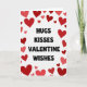 This card features the message “HUGS KISSES VALENTINE WISHES” right in the center. The words are in black, simple sans‑serif letters that look neat and easy to read. Around the text is a border made from many hearts, scattered like confetti in different sizes. The hearts range from deep red to lighter coral-red, which gives the edge a sweet, lively look. The background is white with faint diagonal lines, like lightly textured paper. It feels meaningful to give because it says what you want to say in a direct, caring way, while the hearts add a gentle, loving mood ❤️. It works well for a partner or a close friend when you want to keep things warm and uncomplicated 🥰.