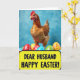 Designed with a springtime scene, the card features a detailed russet-brown hen near the top, its scarlet comb and alert gaze giving the moment a caring, watchful feel. Below her, a clustered row of decorated eggs creates a festive base, with glossy shells in crimson, lemon, emerald, and cerulean. The eggs are covered in simple squiggles, dots, and abstract markings that suggest someone took time to decorate them for a loved one 🐰. Behind everything is a softly blended sky-blue background that keeps the focus on the hen and eggs. A bright yellow rectangular banner sits across the lower middle area, outlined with a thin black border. Centered on the banner, dark lettering reads “DEAR HUSBAND HAPPY EASTER!”, standing out clearly against the yellow. The hen hovers above the colorful eggs while the yellow banner stretches across the scene like a sunny signpost 🌷.