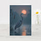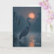 Un héron cendré se tient gracieusement dans des eaux peu profondes entouré de hauts roseaux tandis que la lune rose jette une lueur chaude sur la scène.