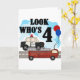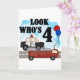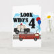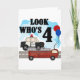 Un croiseur de police, un moteur de pompiers, des ballons et un texte qui dit "Regardez qui est 4" est présenté sur notre design quotidien Héros 4th Birthday.