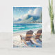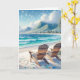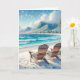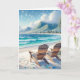 Carte romantique de Saint Valentin. Le texte à l'intérieur peut être personnalisé. Superbe aquarelle d'ai illustrant les vagues bleues de l'océan s'écrasant sur une plage de sable avec un arrière - plan de montagnes et de dunes. Un coeur tiré dans le sable à côté d'un joli verre de mer.