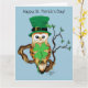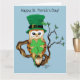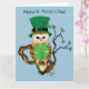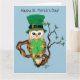 Une chouette barne portant un chapeau vert leprechaun haut avec deux trèfles dedans.