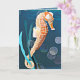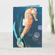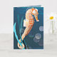 Cette carte de vœux colorée présente mon design d'un hippocampe orange attaché aux algues sur fond d'océan bleu.