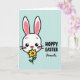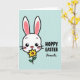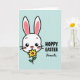 This greeting card features a stylized white rabbit on the left, outlined with dark lines and gazing forward with big black eyes that feel gentle and friendly 🐰. Its long ears show soft pink inside, and a light blush on the cheeks adds a tender, affectionate look. The rabbit holds a yellow flower with a red center and a green stem up near its mouth, like it’s offering a small spring gift. Behind it, the background is pale blue with faint vertical dashed white lines that suggest soft light and fresh air. On the right side, the main text is stacked in dark lettering reading “HOPPY EASTER,” taking up most of the open space. Beneath that, the word “Parents” appears in a flowing cursive style, also in dark ink, adding a warm, close-to-home touch 🌷. The layout keeps the rabbit and the message balanced, with plenty of airy space between them. The yellow bloom sits close to the rabbit’s face, and the dashed white lines run evenly from top to bottom across the blue field.