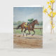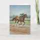 A jockey in green attire races a horse down a dirt track, capturing the speed and energy of the moment. The background shows a clear sky with distant greenery.