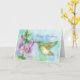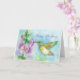 Une carte de voeux d'anniversaire douce et jolie décorée d'un colibri visitant des fleurs de jarret rose lavande peintes en aquarelle.
