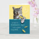 Cette carte humoristique de la Fête des Mères offre beaucoup de "gratitude". La photo en silhouette d'un chat tigre au look tatillon, accrochée à la bouche par une plume jaune, et d'autres tombant le long d'un mur à motif turquoise. Fontes blanches et bleues amusantes pour le sentiment extérieur.