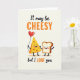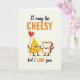 This Valentine’s Day card features two cheerful food characters sharing a sweet moment together. A large yellow slice of cheese with heart-shaped holes holds a red heart balloon, while a slice of toast with a golden center and brown crust reaches toward it. Both characters have smiling faces and rosy cheeks, showing warmth and affection. At the top, mixed lettering reads, “It may be CHEESY,” with bold orange letters highlighting the word “CHEESY.” At the bottom, the message continues with “but I LOAF you,” using the same orange tone for “LOAF.” Set on an off-white background with black outlines, this card blends humor and love into a charming Valentine’s Day message ❤️💌🍫