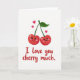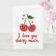 This greeting card features two bright red cherries in the center on a plain white background, linked together by a curved green stem with one green leaf. Each cherry has big shiny black eyes, a wide happy smile, and a soft pink blush on its cheeks that makes them look friendly and sweet. The cherry on the right has its mouth slightly open with a tiny pink tongue showing, like it’s mid-giggle. Three small dark pink hearts float around them, adding a clear romantic touch. Under the cherries, the card reads “I love you cherry much” in red handwritten-style lettering. The simple layout keeps the focus on the cute pair and their cheerful expressions, making it feel perfect for love or close friendship.