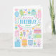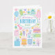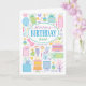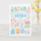 Des gâteaux, des cadeaux, des ballons, des fleurs et des casquettes de fête remplissent cette carte d'anniversaire pour votre tante et forment également la bordure inférieure à l'intérieur de la carte. Une carte d'anniversaire pastel pastel féminine pleine de chaque anniversaire et fête pour elle.