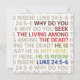 Il est ressuscité d'après Luc 24:5-6. Pourquoi cherchez-vous le vivant parmi les morts? Il n'est pas ici; Il est ressuscité! Célébrez la résurrection de Pâques chrétienne avec ce verset de la Bible de Jésus-Christ.