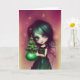 Mia, illustration de carte de vœux de Noël par Ricaso - une illustration d'une petite fille aux cheveux verts et à la robe verte tenant un petit arbre de Noël.