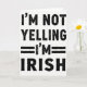 This card features a high-contrast black-and-white layout with the phrase “I’M NOT YELLING I’M IRISH” centered in large, uppercase sans‑serif letters across four stacked lines. The white background stays open and airy, letting the heavy black type feel like it’s leaning in close, the way a friend might grin and nudge you during a lively toast 💚. Each letter has a worn, speckled texture, with tiny white flecks breaking up the black ink like a well-loved print that’s been passed around. Two thick horizontal bars sit on either side of “I’M” on the third line, like a pair of arms bracketing the word in a confident, teasing embrace ☘️. The text is set dead center, with even spacing between lines that keeps the message tightly grouped and easy to read. There are no characters or scenery, but the stacked wording and gritty texture create the sense of a cheeky back-and-forth between close friends. The final look is stark and graphic, with solid black letters and distressed speckles standing out sharply on a plain white field.