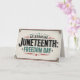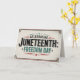 Cette conception présente une esthétique classique et intemporelle pour commémorer le 11° Jeudi, également connu sous le nom de Journée de la Liberté. Le design affiche en évidence "CÉLÉBRER JUNETEENTH : FREEDOM DAY" dans un style rappelant la signalisation vintage, avec des étoiles et des détails de bordure. Cette oeuvre offre un clin d'oeil respectueux à l'importance historique de l'émancipation des Afro-Américains esclaves. Partagez le message durable de liberté et d'égalité avec ce design intemporel du 18ème siècle