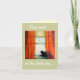 Carte de note avec l'image du chat dans la fenêtre avec les rideaux oranges