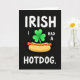 This design shows a black background with large white text reading “IRISH I HAD A HOTDOG,” arranged in a centered stack that feels like a cheeky note shared between friends on St. Patrick’s Day 💚. In the word “IRISH,” a bright emerald shamrock replaces the “SH,” its soft highlights making it look gently lit, like a lucky charm slipped into the message ☘️. The clover sits right in the middle of the top line, drawing your eye the way a knowing glance does when two people share the same joke. Beneath the text, a cartoon hotdog rests front and center, with a red sausage tucked into a warm golden-brown bun. A wavy stripe of yellow mustard zigzags across the top, adding a cozy, craveable detail that feels like an easy date-night snack. The spacing around each element keeps the joke easy to read, with the white letters standing out sharply against the dark background. The overall layout stays simple and focused, with the shamrock acting as the visual bridge between the wordplay above and the hotdog below. The mustard line curves in three loose waves from left to right across the sausage.